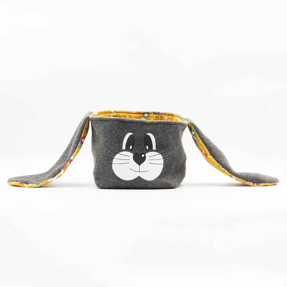 Die Grundfläche beträgt ca. 13x13cm bei einer Korbhöhe von ca. 12cm. Die Ohren sind ca. 20cm lang und ca. 8cm breit.
