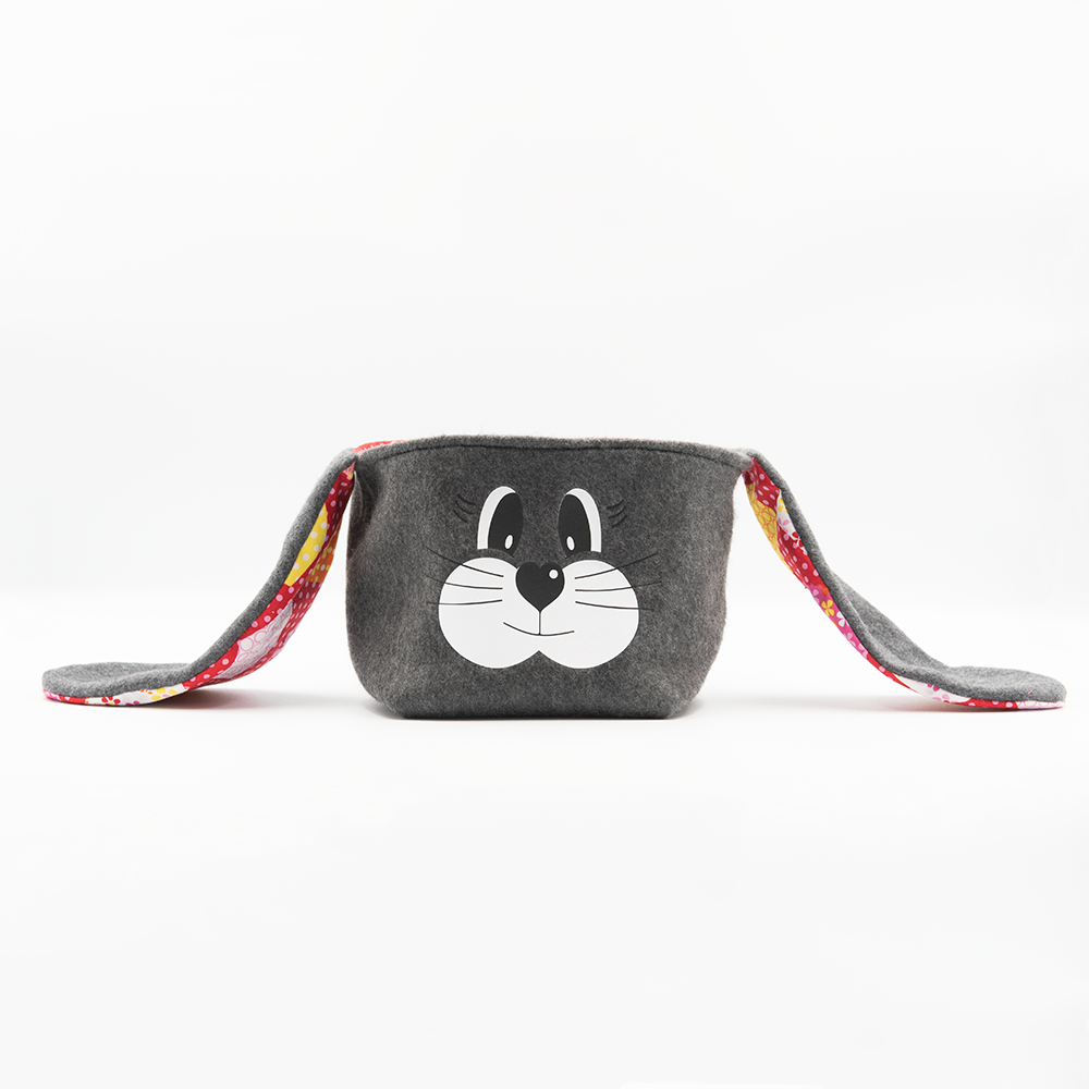 Die Grundfläche beträgt ca. 13x13cm bei einer Korbhöhe von ca. 12cm. Die Ohren sind ca. 20cm lang und ca. 8cm breit.